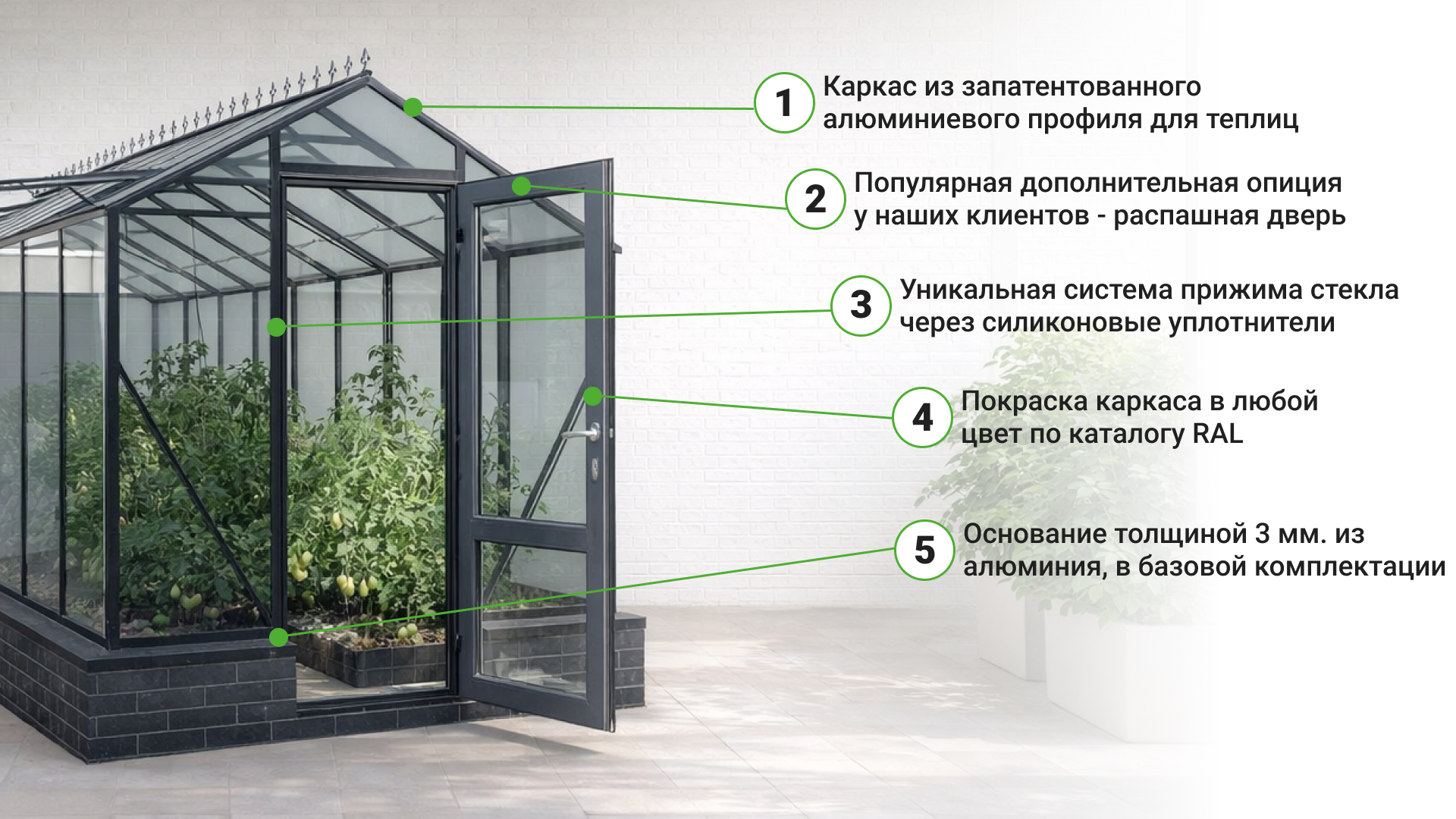 - Покрытие — стекло 4 мм (сырое или закалённое, возможна установка 5 мм) обеспечивает высокую светопроницаемость, за счёт чего вы получаете много прозрачности и естественного освещения, а растения развиваются в максимально благоприятных условиях.