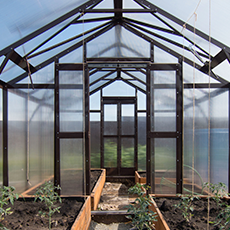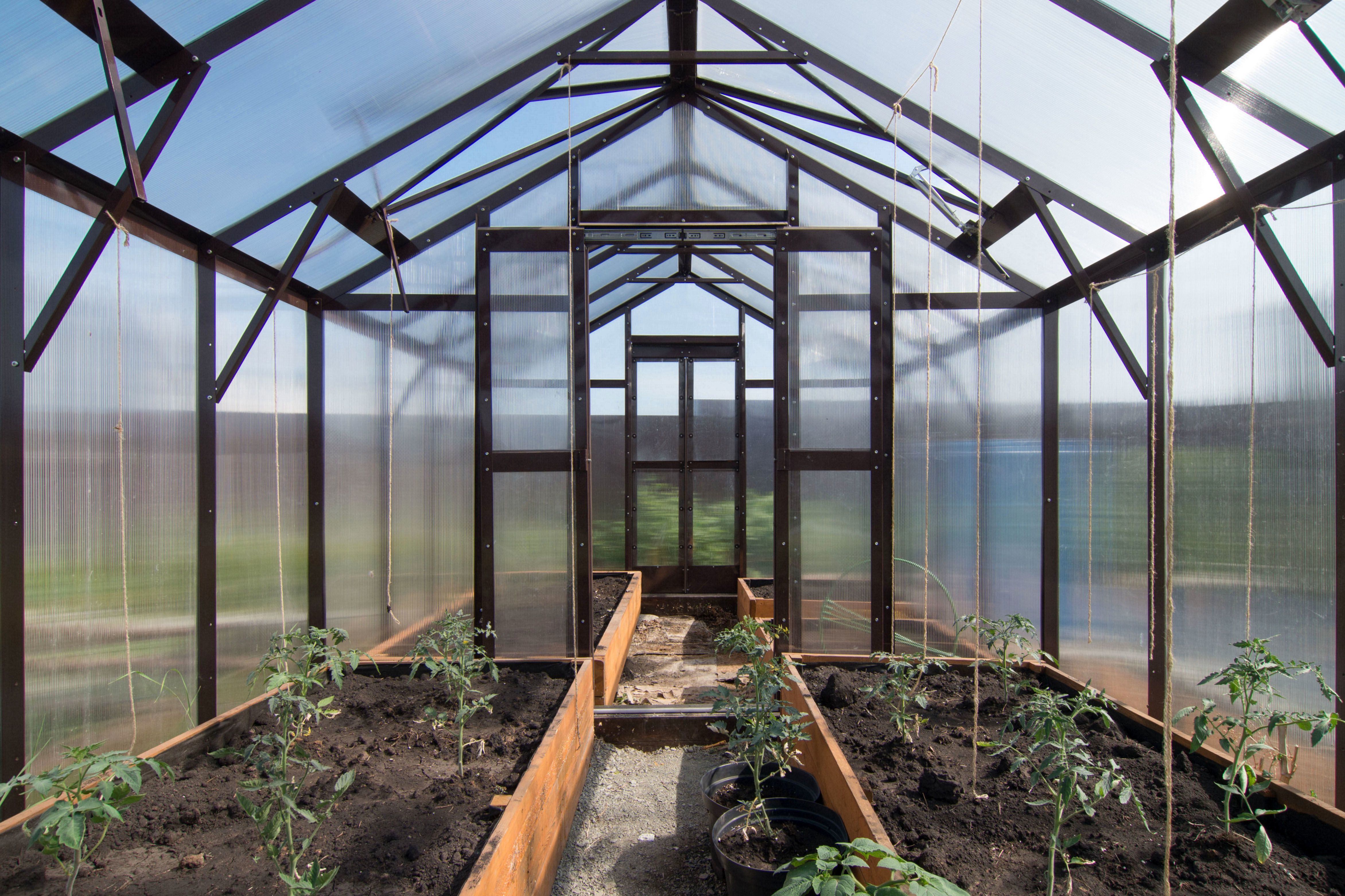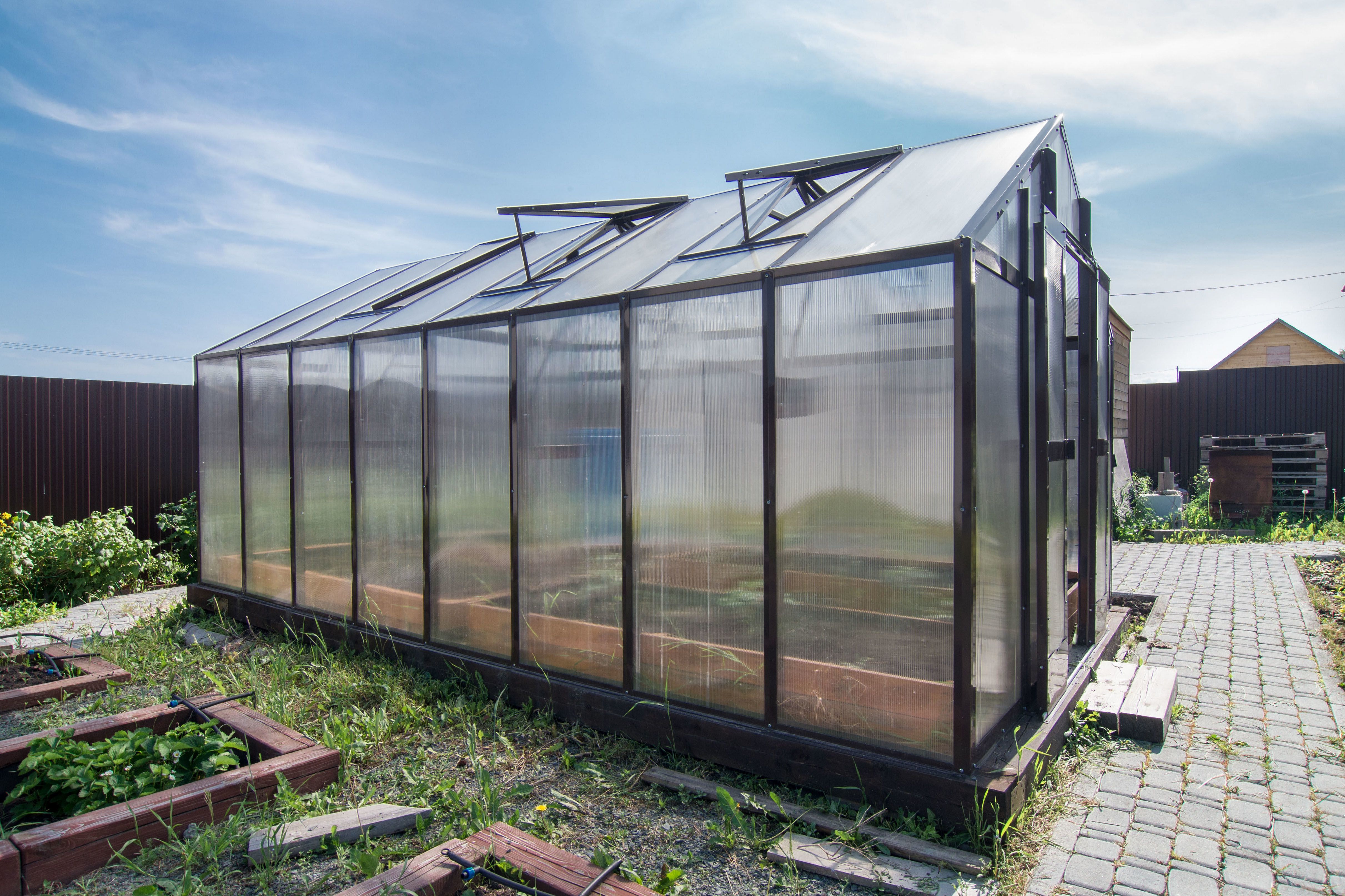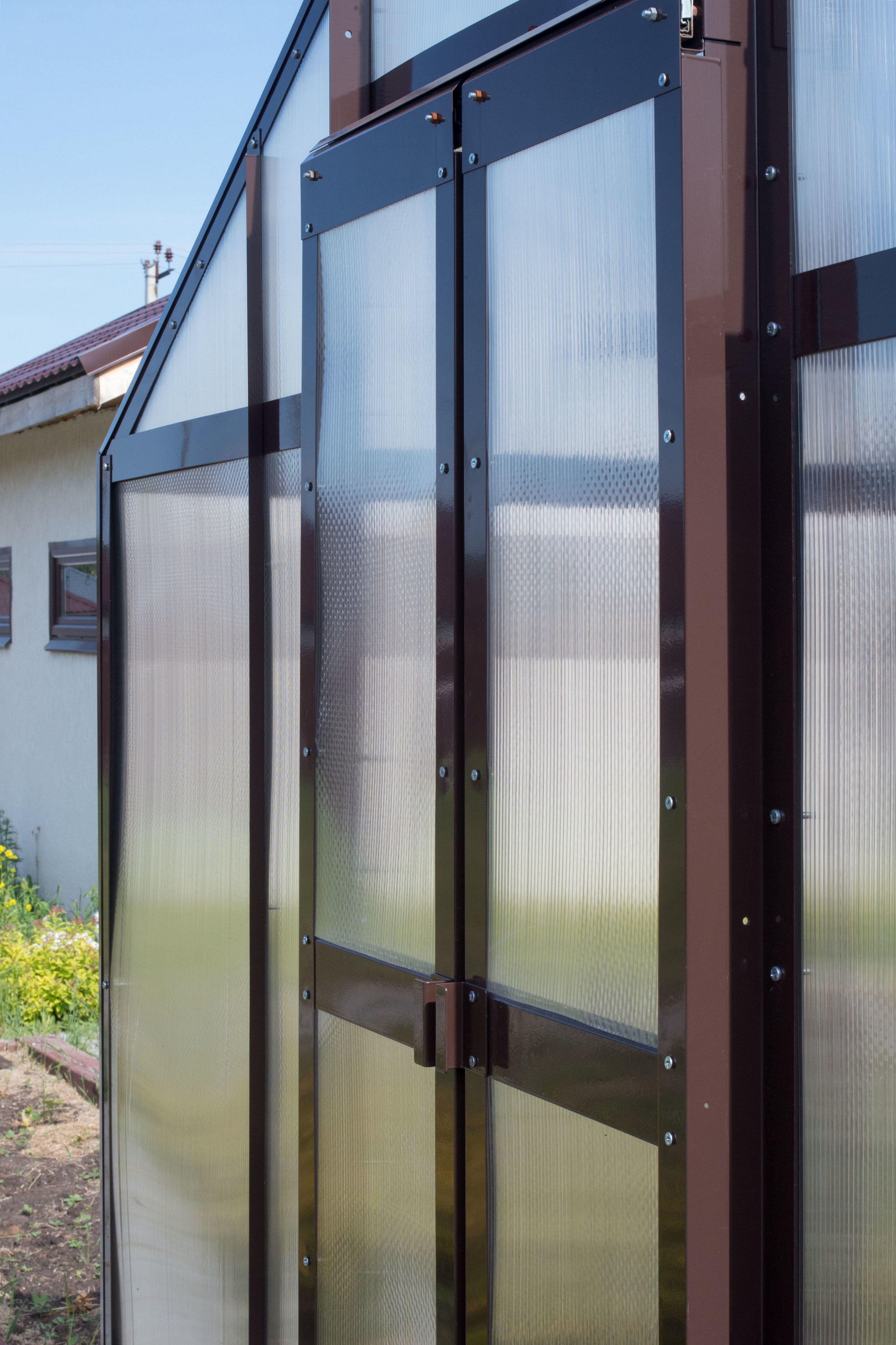 В качестве покрытия используется сотовый поликарбонат, который производится методом экструзии и имеет ячеистую структуру. Он хорошо удерживает тепло и рассеивает солнечный свет внутри теплицы.