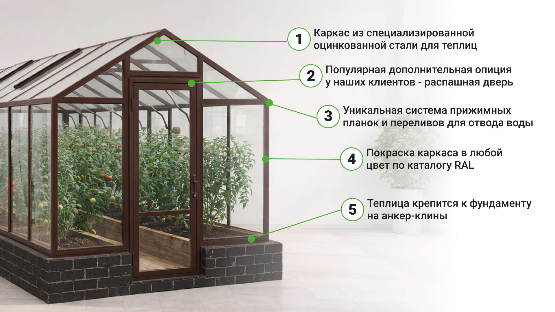 - Каркас из специализированного оцинкованного тепличного профиля толщиной от 1,5 до 3,0 мм обеспечивает высокий запас прочности, так как усиленные стойки выдерживают снеговые и ветровые нагрузки, и вы получаете надёжную основу с аккуратным каркасом и достойным внешним видом.
