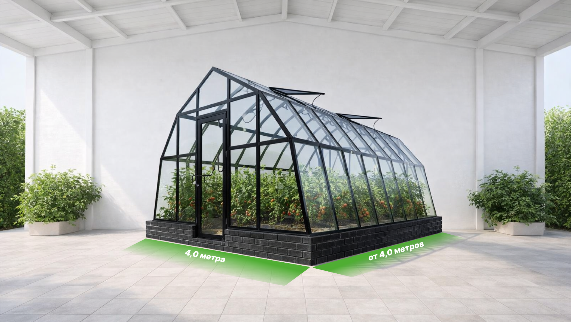 Длина базовой теплицы - 4,0 м. с двойной дверью-купе и двойной форточкой в крыше.