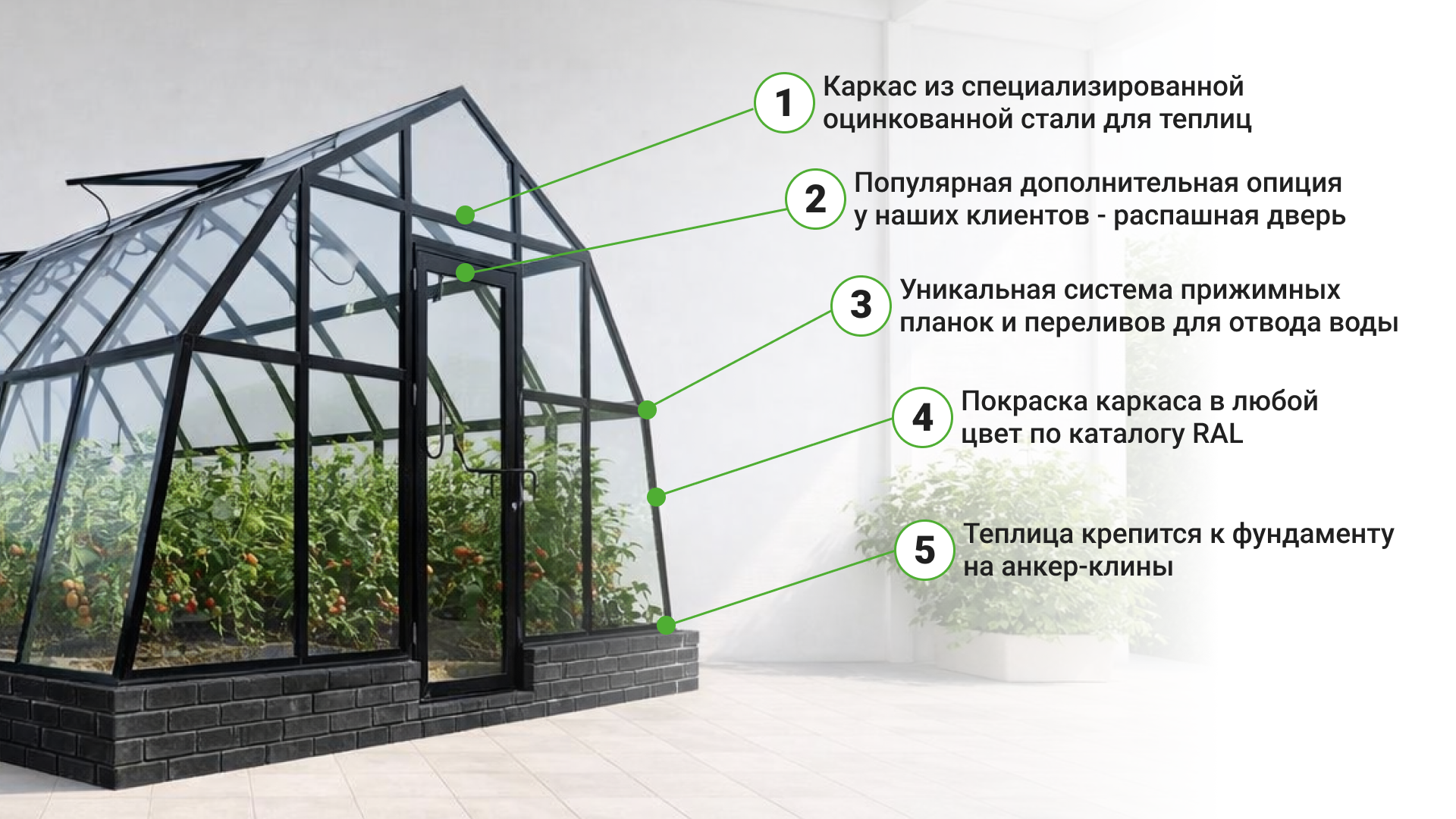 Полимерная окраска усиливает защиту и создаёт премиальный внешний вид, подчёркивая строгую форму и аккуратный профиль теплицы.