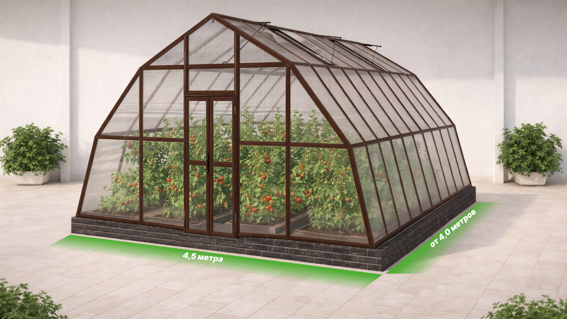 Длина базовой теплицы - 4,0 м., в комплекте: двойная дверь-купе и две форточки в крыше.