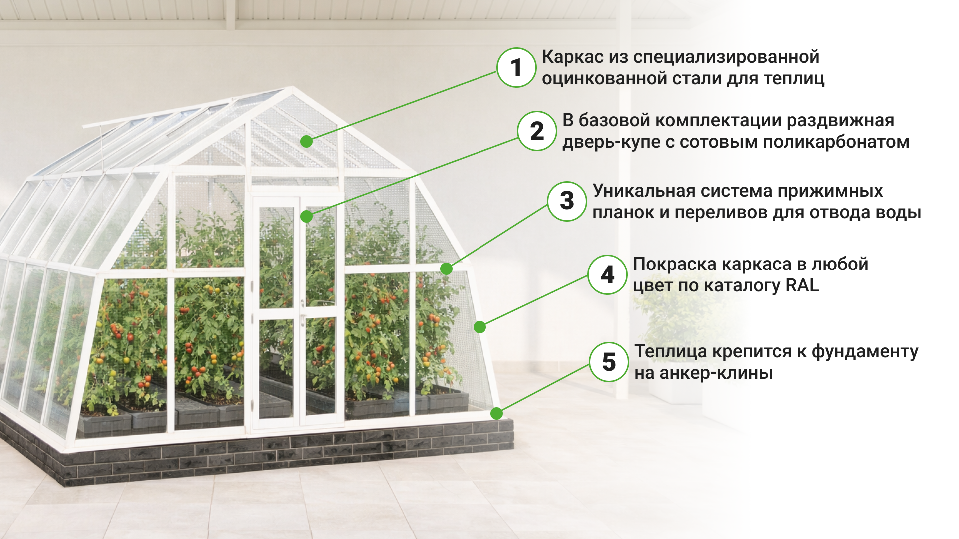 Мы предлагаем широкий выбор оснащения, помогаем с визуализацией теплицы на вашем участке и сопровождаем проект на всех этапах — от подбора до монтажа.