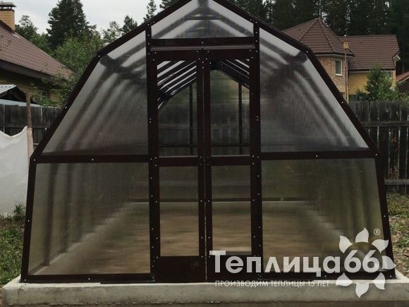 - Трёхскатная мансардная крыша — форма способствует сходу снега зимой, что снижает нагрузку на покрытие; при этом благодаря трём скатам внутри больше полезного пространства, а сама теплица выглядит как мини-оранжерея с лаконичной архитектурой.