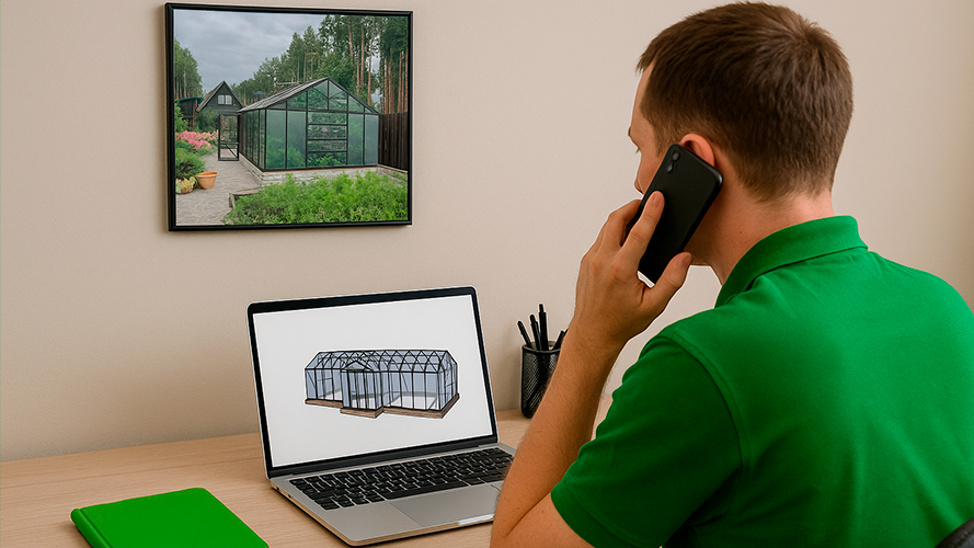 После обращения в компанию менеджер связывается с клиентом, чтобы уточнить все детали. Не просто габариты или материал, а то, каким человек представляет себе будущую теплицу: