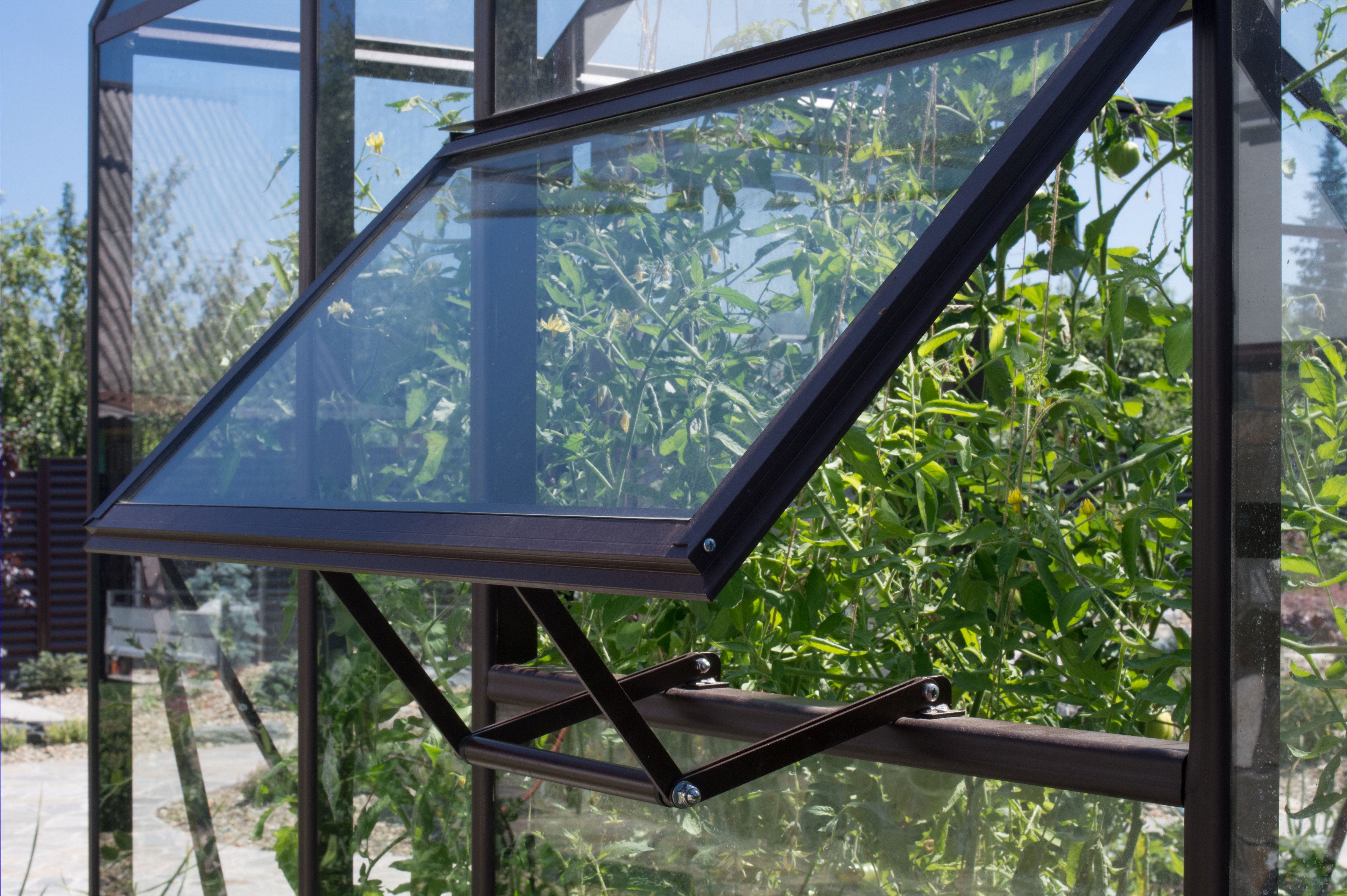 Теплица поставляется со всеми крепежными элементами в комплекте, конструкция оборудована одностворчатой дверью купейного типа, четырьмя форточками в крыше и двумя боковыми форточками с глухих торцов.